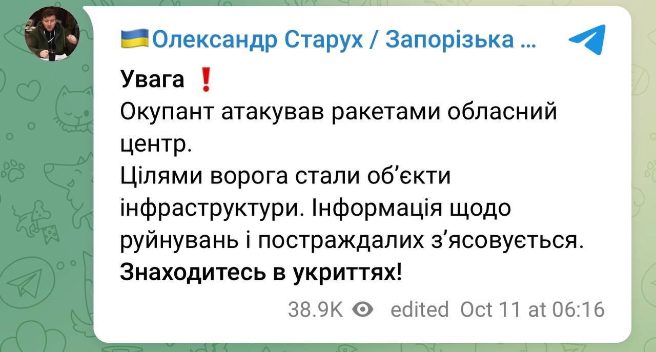 Утром во вторник, 11 октября, россияне нанесли удар по Запорожью. Целями стали объекты инфраструктуры.