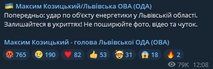Кроме того, глава Львовской ОВА Максим Козицкий также сообщает об ударах по объекту энергетики во Львовской области.