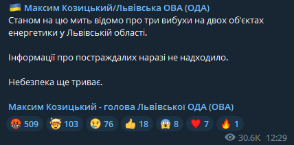 "На данный момент известно о трех взрывах на двух объектах энергетики во Львовской области. Информация о пострадавших пока не поступала", - написал Козицкий.