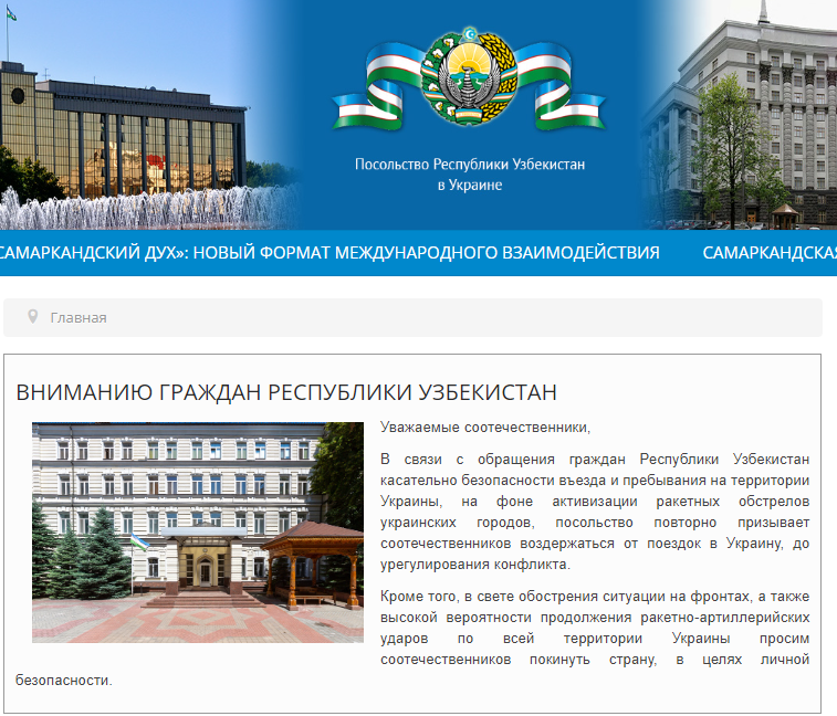 "В связи с обращениями граждан Республики Узбекистан касательно безопасности въезда и пребывания на территории Украины, на фоне активизации ракетных обстрелов украинских городов, посольство повторно призывает соотечественников воздержаться от поездок в Украину, до урегулирования конфликта.