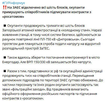 На данный момент известно, что удалось сохранить электроснабжение оккупированного Энергодара. Однако представители оккупационной власти продолжают давить на сотрудников ЗАЭС - ограничивают их передвижение по станции, часть персонала и их семьи подвергаются так называемым "фильтрационным мерам". От работников требуют вступить в российское гражданство и подписать контракты с "Росатомом".