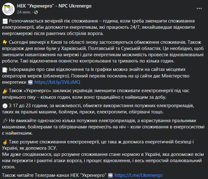 Об этом сообщает Укрэнерго.