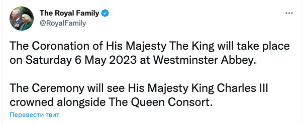 Объявлена официальная дата церемонии коронации британского короля Карла III. Она состоится в субботу, 6 мая 2023 года, в Вестминстерском аббатстве.