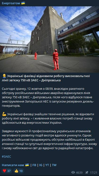 "Сегодня утром, 12 октября в 08:59, в результате ракетных обстрелов российскими войсками аварийно отключилась линия связи 750 кВ ЗАЭС – Днепровская, после чего произошло полное обесточивание Запорожской АЭС с запуском резервных дизель-генераторов. Украинские специалисты нашли техническое решение, как возобновить работу линии связи – и питание собственных потребностей станции снова осуществляется от энергосистемы Украины", - говорится в сообщении.