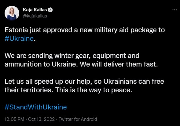 "Давайте все ускорим нашу помощь, чтобы украинцы могли освободить свои территории. Это путь к миру", - написала Каллас в Twitter.