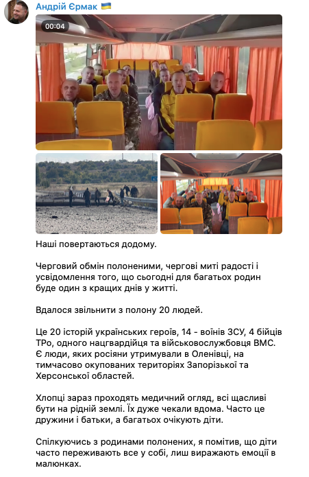 Освобождены 14 бойцов ВСУ, 4 бойца теробороны, один нацгвардеец и военнослужащий ВМС. Фото: Андрей Ермак