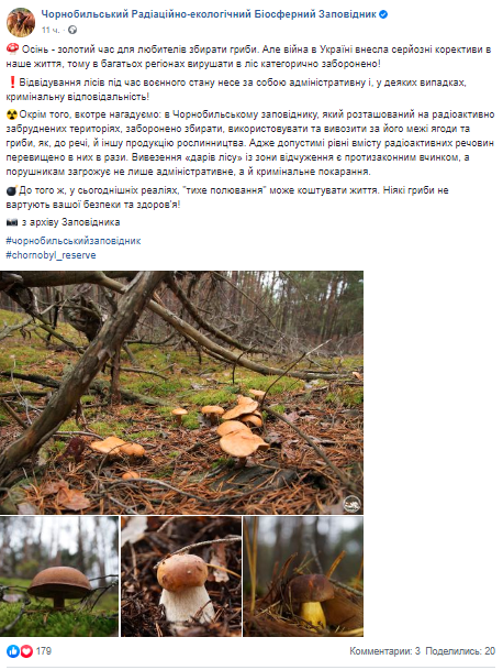 В Чернобыльском радиационно-экологическом биосферном заповеднике рассказали, что в военное время запрещено ходить в лес, а в зоне отчуждения запрещено собирать ягоды и грибы, так как это может повлечь необратимые последствия для человеческого здоровья.