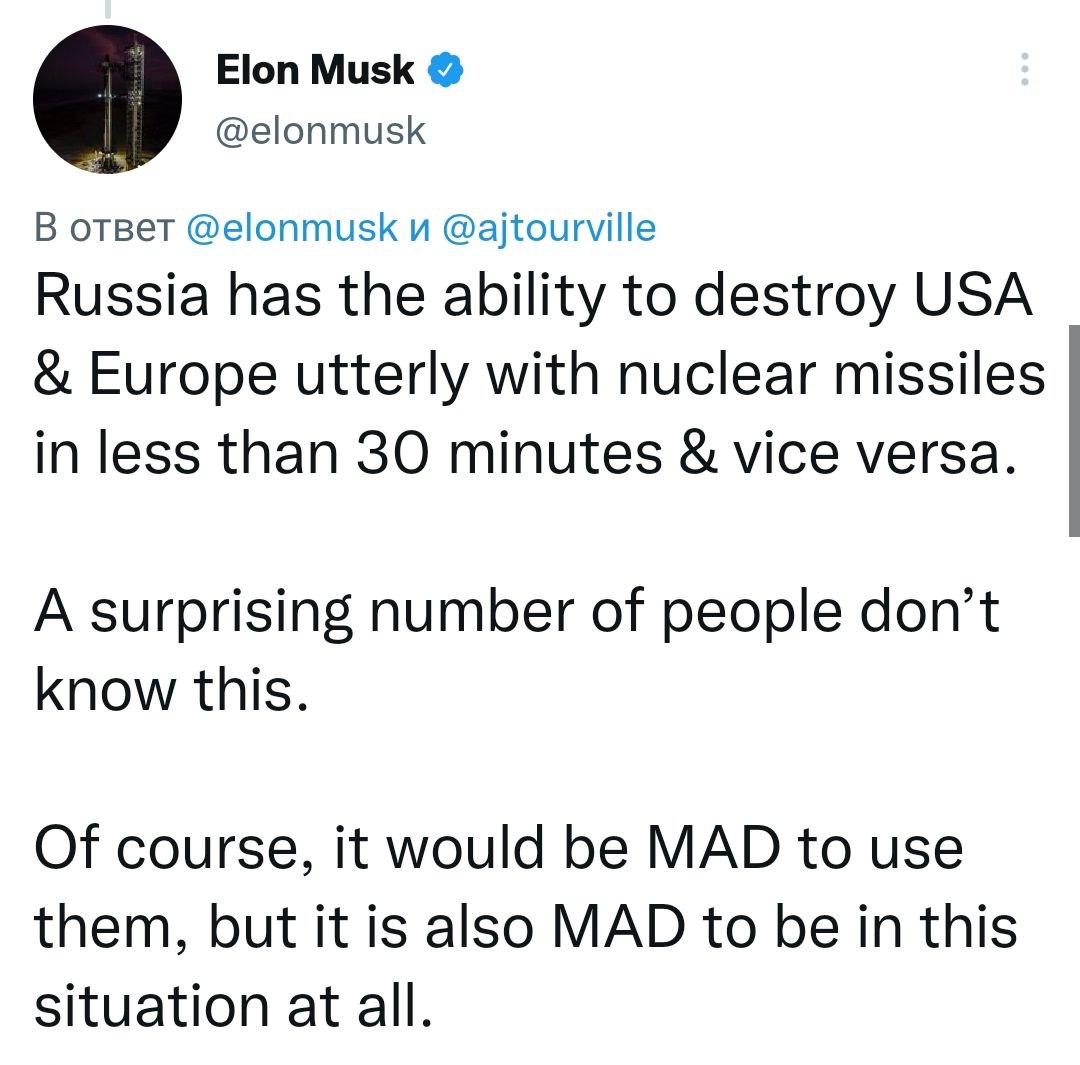 Напомним, Илон Маск в последнее время настойчиво предлагает провести деэскалацию между Западом и Россией для избежания атомной войны.
