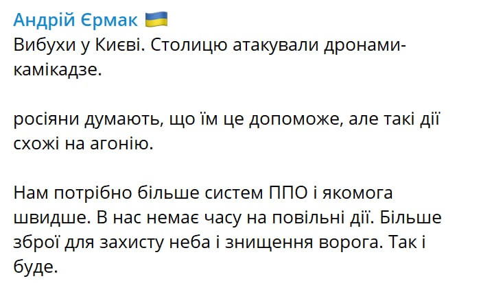 07:12 Глава Офиса президента Андрей Ермак подтвердил атаку дронов-камикадзе по Киеву.
