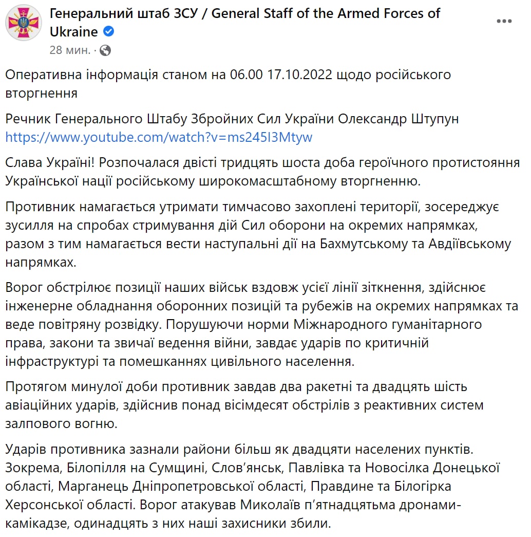 07:17 Сводка Генштаба ВСУ на утро 17 октября.