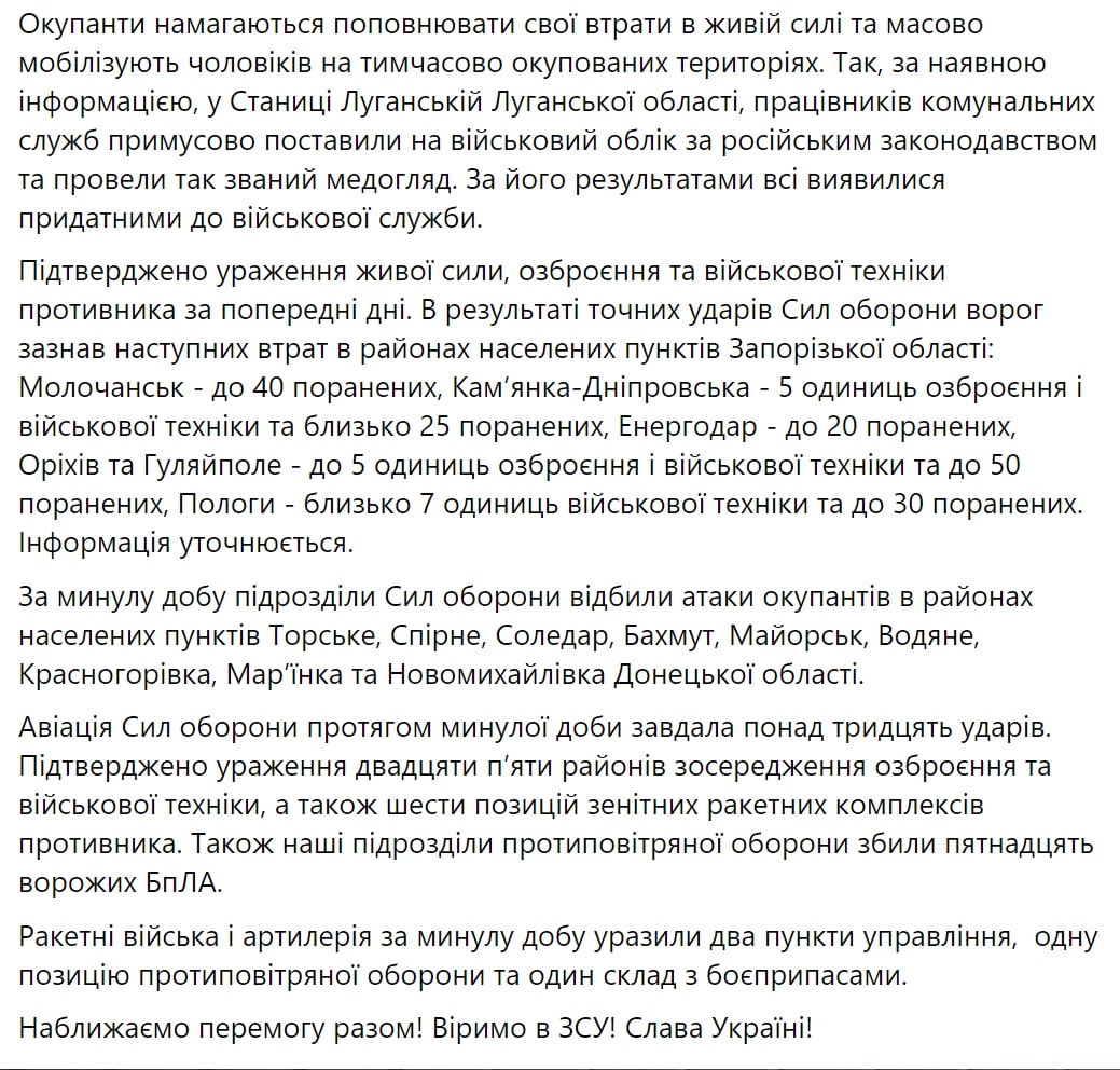 Там были отражены атаки в районах населенных пунктов Торское, Спорное, Соледар, Бахмут, Майорск, Водяное, Красногоровка, Марьинка и Новомихайловка.