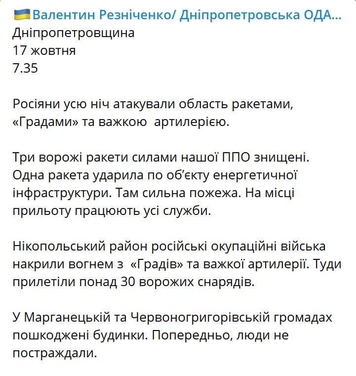 07:45 Несмотря на три сбитые ракеты, одна из них ударила по объекту энергетики в Днепропетровской области. Об этом пишет губернатор Валентин Резниченко.