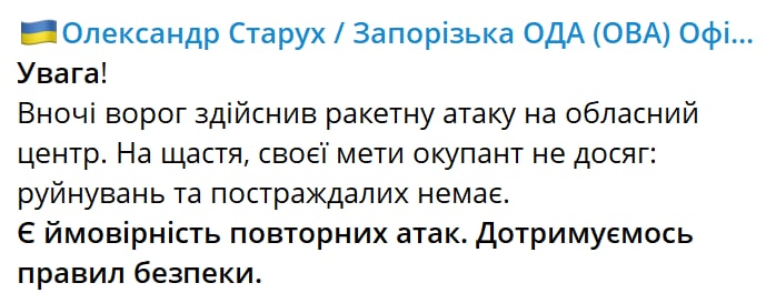 08:07 Ракеты этим утром также атаковали Запорожье. Как сообщает губернатор - без жертв и разрушений.
