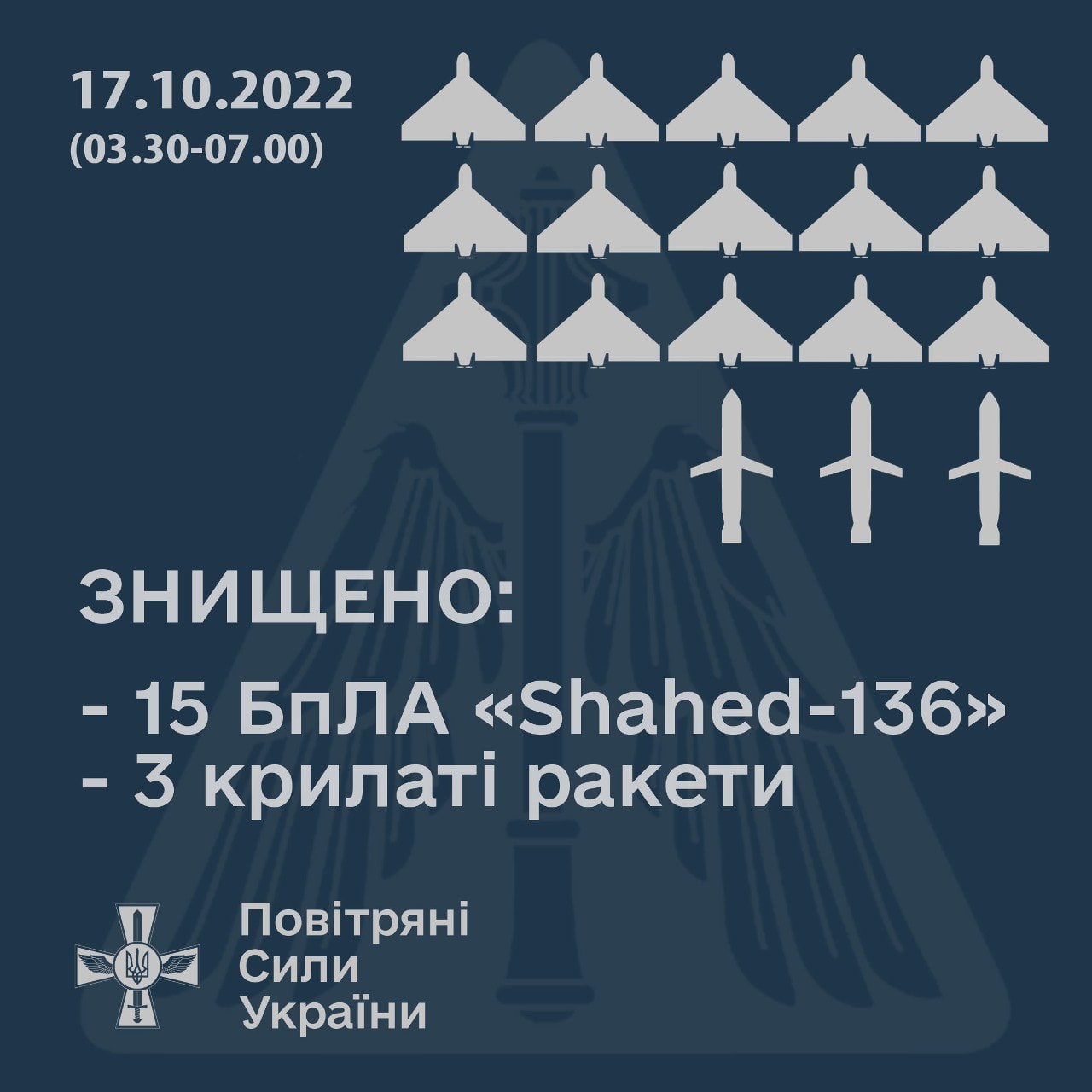 09:16 На юге уничтожены 15 дронов-камикадзе, на востоке - 3 крылатые ракеты, сообщают Воздушные силы ВСУ.