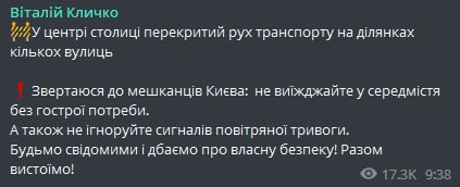 Он призвал жителей не выезжать в центр города без острой потребности и не игнорировать сигналов воздушной тревоги.