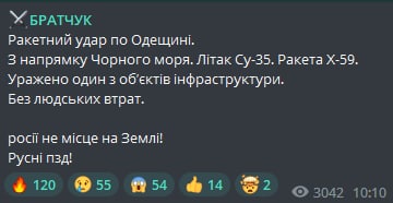 "Самолет Су-35. Ракета Х-59. Поврежден один из объектов инфраструктуры. Без человеческих потерь", - сообщил спикер Одесской ОГА Сергей Братчук.