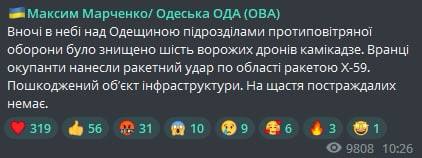10:15 Со стороны Черного моря по Одесской области нанесен ракетеный удар.