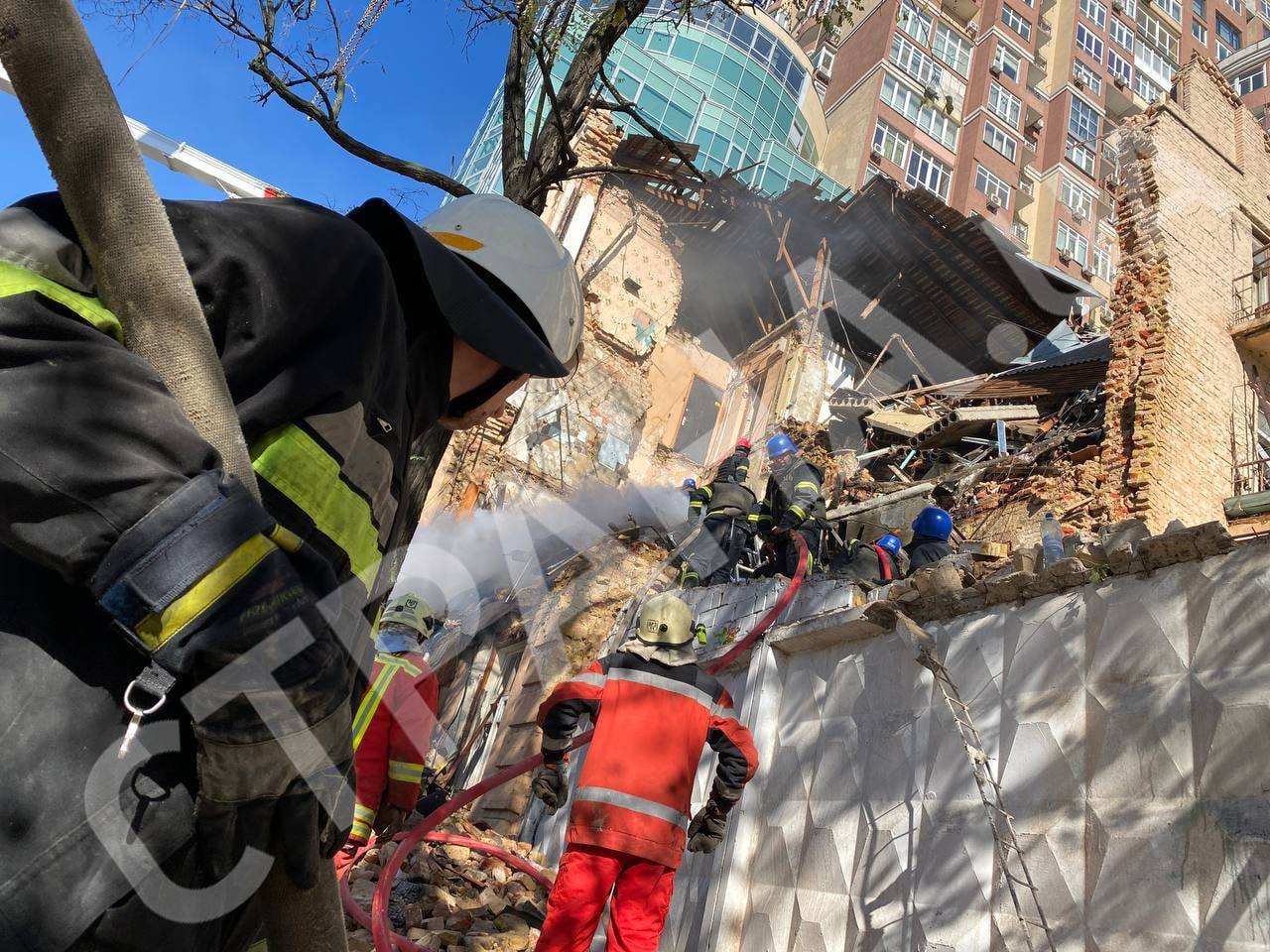 Горит дом на Жилянской. На месте работает несколько десятков сотрудников ГСЧС и несколько десятков единиц техники. Спасатели продолжают прибывать.