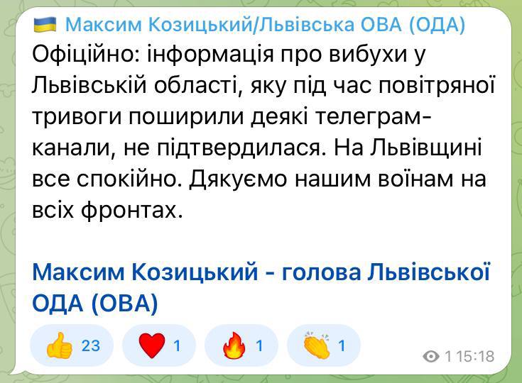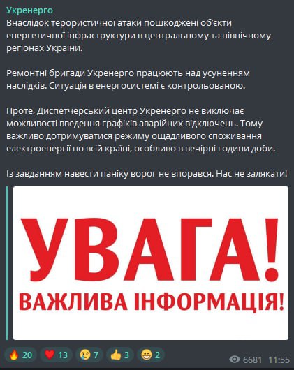 «Сегодня вечером диспетчерский центр НЭК "Укрэнерго" не отдавал команды на введение графиков аварийных отключений потребителей Кировоградской, Запорожской и Днепропетровской областей», – говорится в сообщении на тг-канале компании.