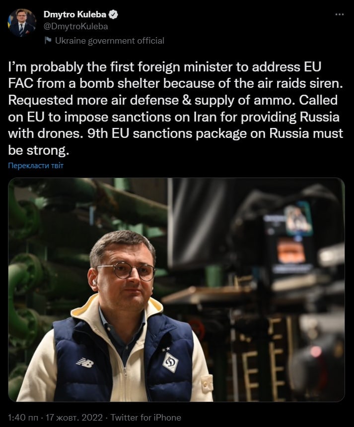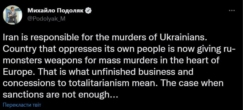 «Предоставление оружия для ведения захватнической войны в Украине и убийства украинских граждан делает Иран соучастником преступления агрессии, военных преступлений и террористических актов России против Украины.
