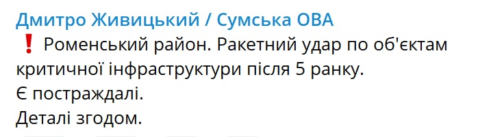 "Роменский район. Ракетный удар по объектам критической инфраструктуры после 05:00. Есть пострадавшие. Детали позже", - сообщил он.