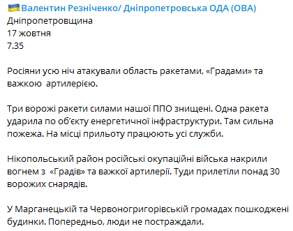 Глава Днепропетровской ОВА Валентин Резниченко сообщил, что россияне всю ночь атаковали область ракетами, "Градами" и тяжелой артиллерией. Об этом он написал в своем телеграм-канале.