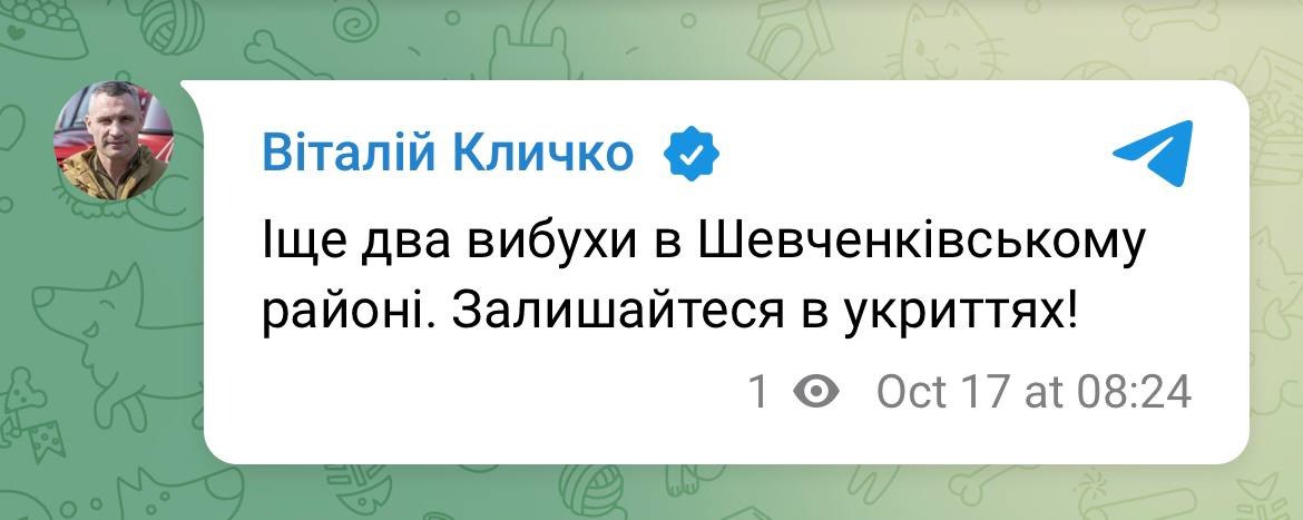 Утром 17 октября в Киеве продолжают раздаваться взрывы. Еще два взрыва зафиксировали около половины девятого утра.