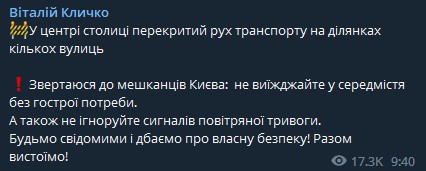Он также обратился к жителям Киева и попросил не выезжать в центр города без острой необходимости.