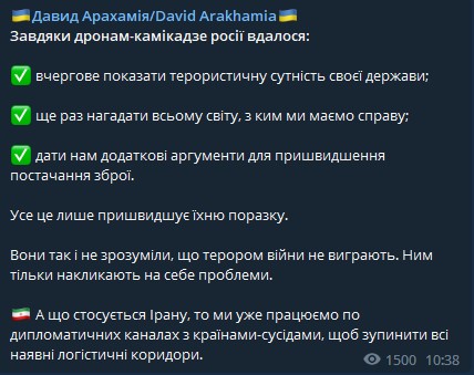 Украина работает с соседями Ирана, чтобы остановить все коридоры поставок иранского оружия в РФ - Арахамия