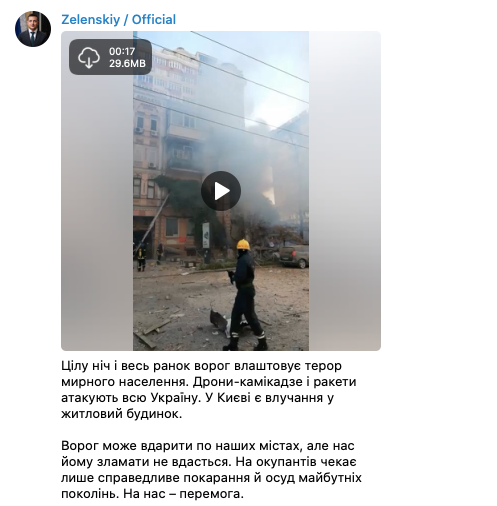 "Всю ночь и все утро враг устраивает террор мирного населения. Дроны-камикадзе и ракеты атакуют всю Украину. В Киеве есть попадания в жилой дом. Враг может ударить по нашим городам, но нас сломать не удастся. Оккупантов ждет только справедливое наказание и осуждение будущих поколений. Нас – победа", - написал Зеленский в телеграм-канале.