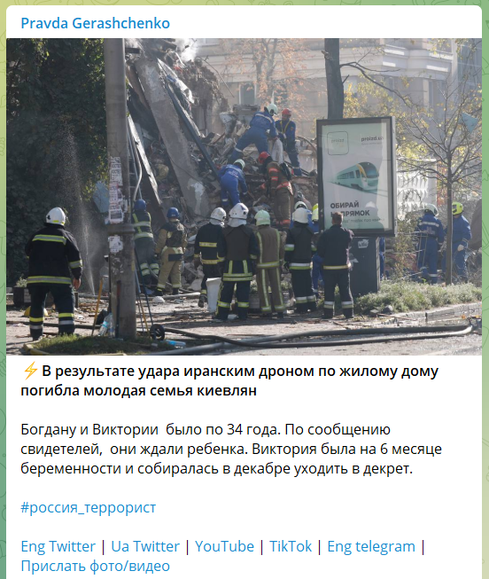 В результате удара иранским дроном по жилому дому погибла молодая семья киевлян, сообщил советник министра внутренних дел Антон Геращенко.