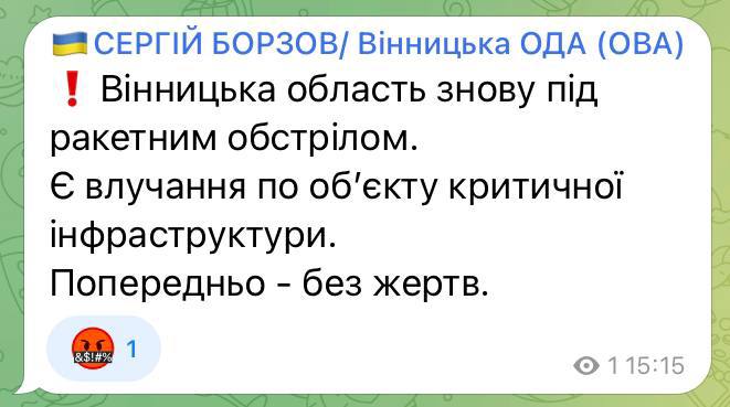 В понедельник, 17 октября, глава Винницкой ОВА Сергей Борзов сообщил о ракетном ударе по объекту критической инфраструктуры в Винницкой области. Предварительно обошлось без жертв.