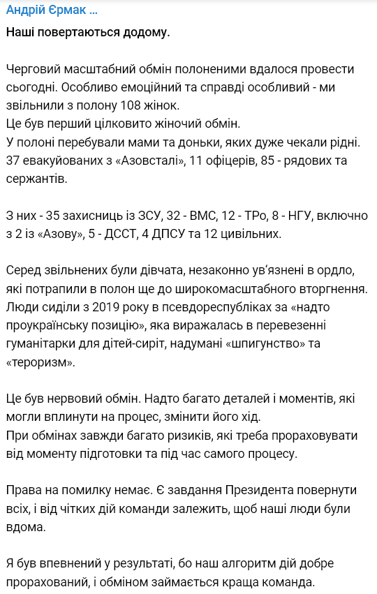 Глава Офиса президента Украины Андрей Ермак сообщил подробности очередного обмена пленными. Домой вернулись более сотни украинских женщин.