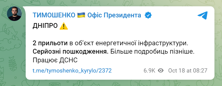 Утром во вторник, 18 октября, россияне нанесли удары по объекту энергетической инфраструктуры Днепра.