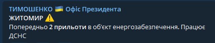 "Житомир. Предварительно два прилета в объект энергообеспечения", - написал он.