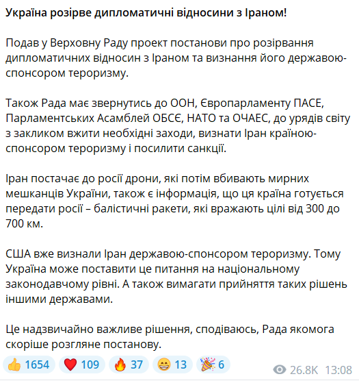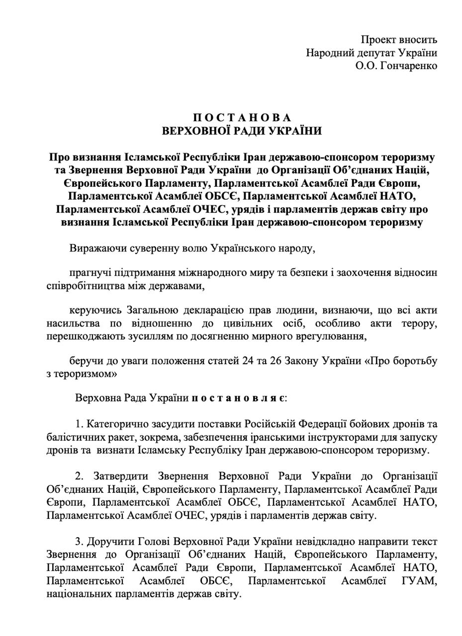 "Также Рада должна обратиться в ООН, Европарламент ПАСЕ, Парламентские Ассамблеи ОБСЕ, НАТО и ОЧАЭС, к правительствам мира с призывом принять необходимые меры, признать Иран страной-спонсором терроризма и усилить санкции", – добавил Гончаренко.
