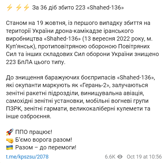 "По состоянию на 19 октября, с первого случая сбивания на территории Украины дрона-камикадзе иранского производства "Shahed-136" (13 сентября 2022 года, г. Купянск), противовоздушной обороной Воздушных сил и других составляющих Сил обороны Украины уничтожено 223 БпЛА этого типа", - сообщает командование Воздушных сил.
