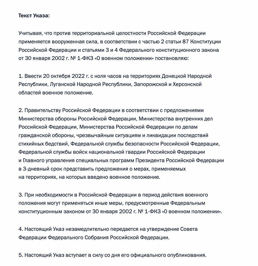 Появился текст указа президента РФ Владимира Путина о введении военного положения на аннексированных территориях Украины.