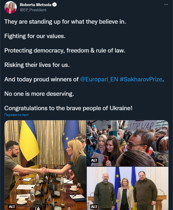 Европарламент присудил премию Сахарова украинскому народу и Зеленскому. Фото: Twitter/ EP_President
