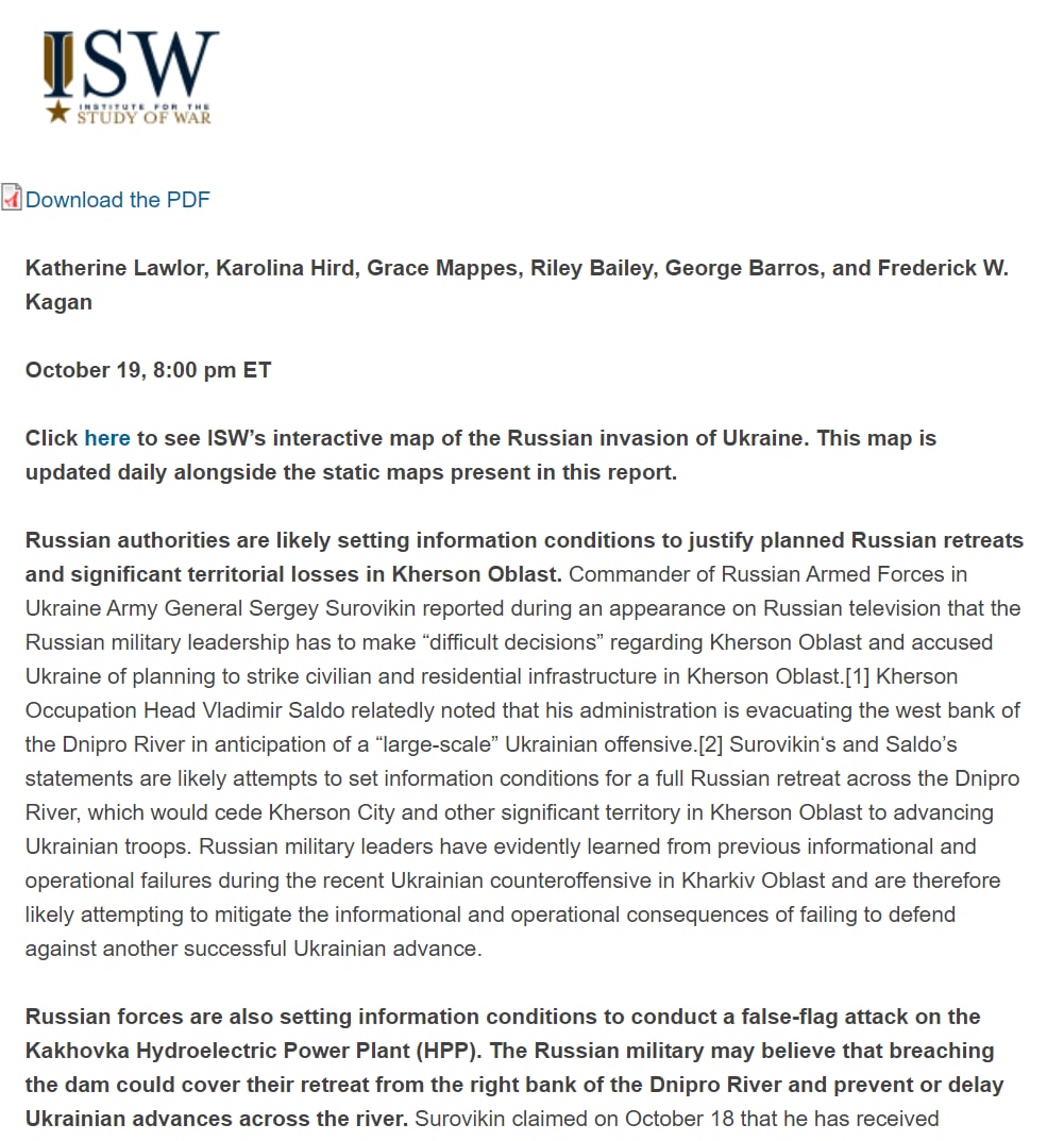 Американский "Институт изучения войны" пишет, что заявления Суровикина "вероятно, являются попыткой создать информационные условия для полного отступления русских за Днепр, в результате чего город Херсон и другие значительные территории в Херсонской области уступят наступающим украинским войскам".