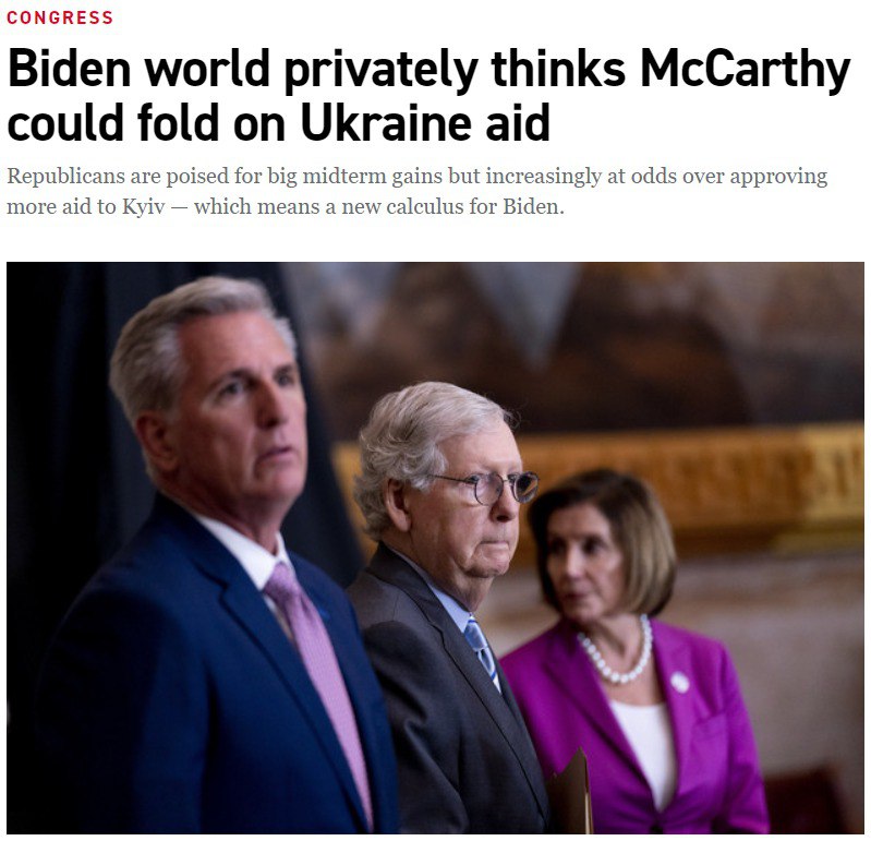 «Когда лидер меньшинства Кевин Маккарти — вероятный спикер Палаты представителей Республиканской партии в следующем году — предложил на этой неделе отказаться от американского финансирования борьбы Украины против России, это был не первый сигнал администрации Байдена о том, что республиканские законодатели проявляют осторожность в отношении продолжительной финансовой поддержки Киева.