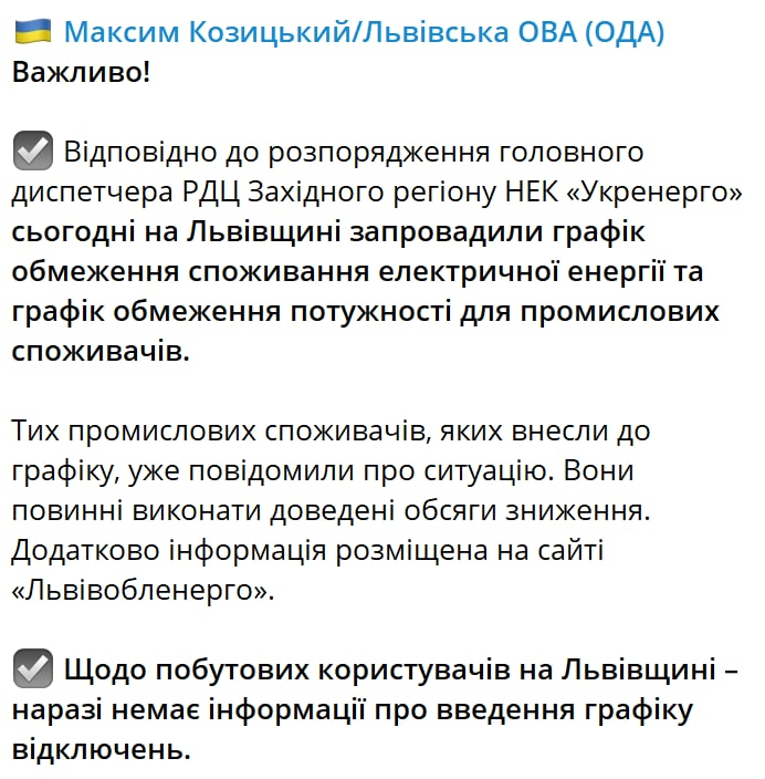 "Сегодня во Львовской области ввели график ограничения потребления электрической энергии и график ограничения мощности для промышленных потребителей. Тем промышленным потребителям, которые были внесены в график, уже сообщили о ситуации. Они должны выполнить приведенные объемы снижения (потребления - Ред.). Дополнительная информация размещена на сайте "Львовоблэнерго". Относительно бытовых пользователей во Львовской области – пока нет информации о введении графика отключений", - говорится в сообщении.