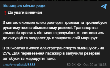 "С 20 октября выпуск электротранспорта сокращается на 25%. Для перевозки пассажиров были привлечены резервные автобусы и маршрутные такси", - отмечается в сообщении в телеграм-канале.