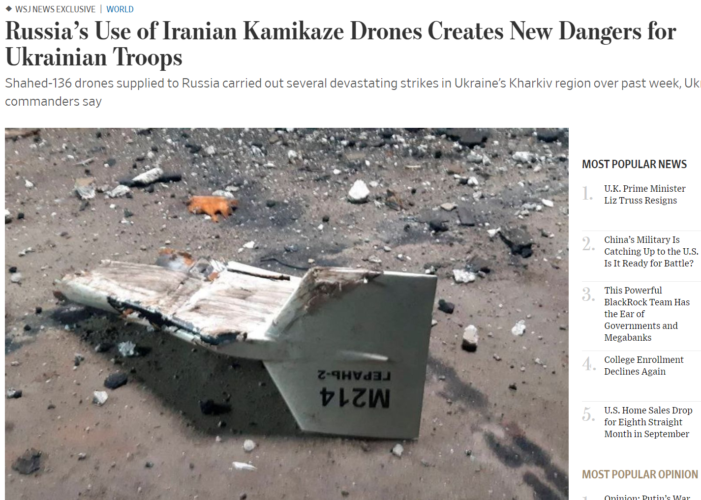 Еще месяц назад, 17 сентября, издание The Wall Street Journal анализировало данные о первом появлении иранских беспилотников в Украине. Как раз тогда в Харьковской области сбили первый из них.