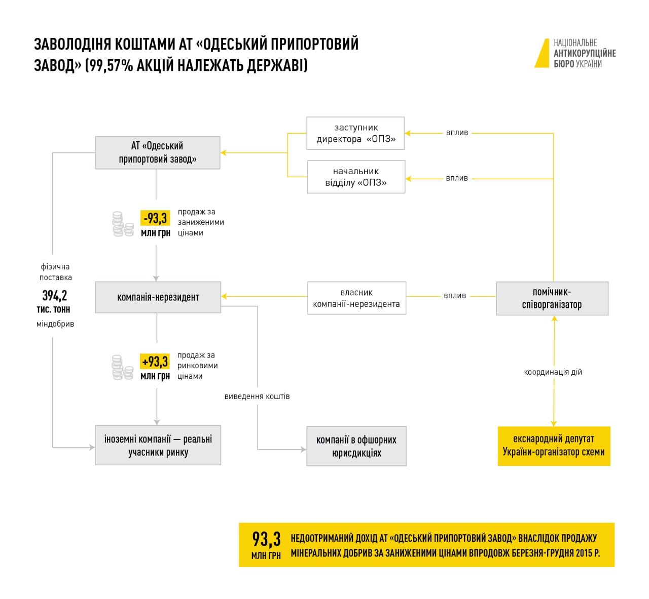 НАБУ сообщает, что экс-депутат парламента организовал схему, по которой завод продавал минеральные удобрения заранее определенной компании по ценам ниже рыночных.
