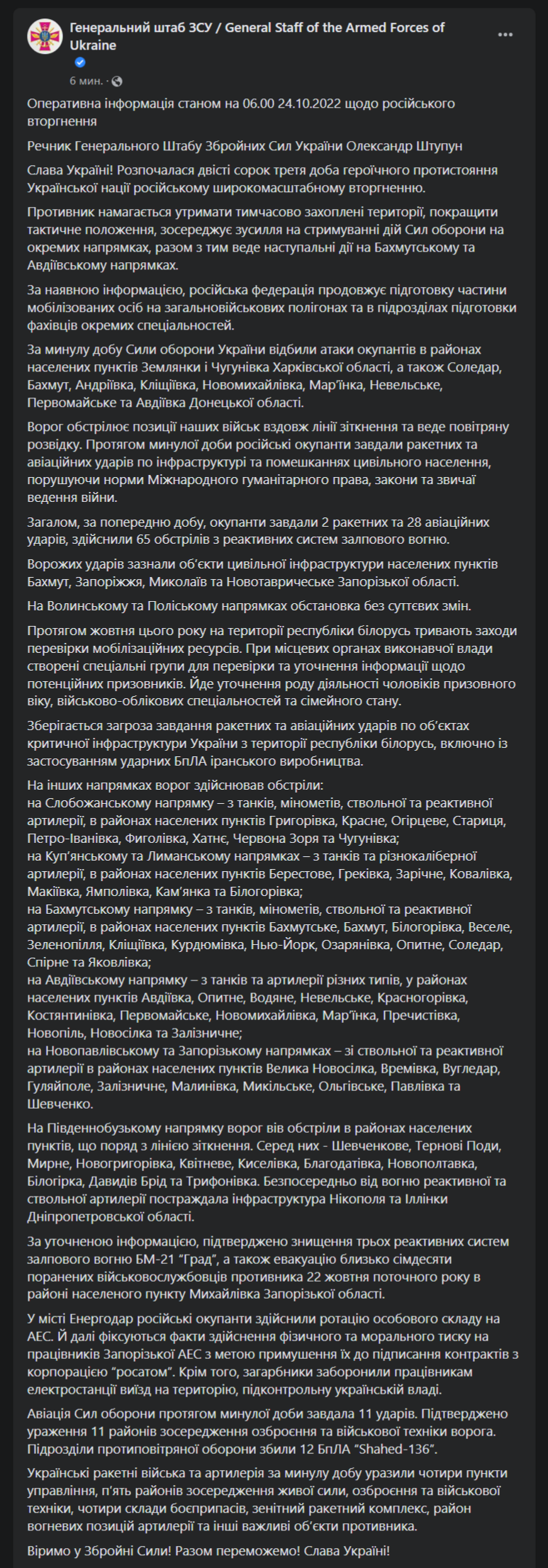 1. За сутки атаки россиян отбиты в районах населенных пунктов Землянки и Чугуновка Харьковской области, а также Соледар, Бахмут, Андреевка, Клещеевка, Новомихайловка, Марьинка, Невельское, Первомайское и Авдеевка Донецкой области.