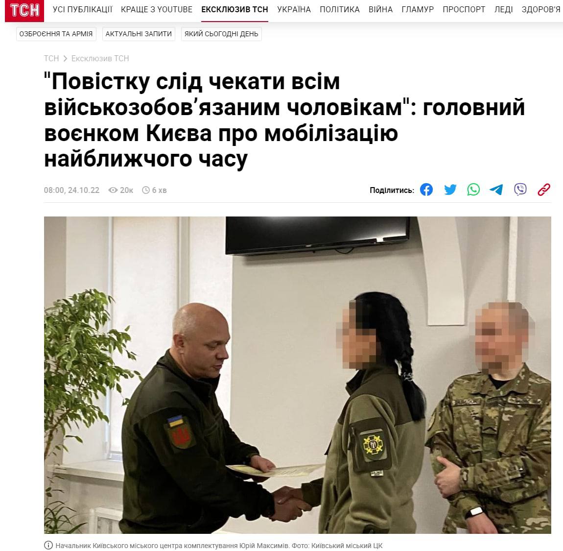 09:26 "Повестку следует ждать всем военнообязанным мужчинам", заявил главный военком Киева Юрий Максимов.