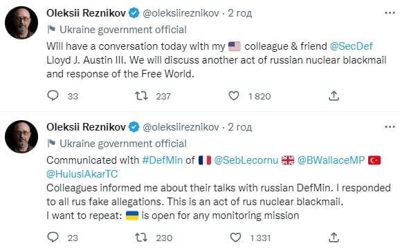 "Министры обороны каждой из наших стран разговаривали с российским министром обороны Сергеем Шойгу по его просьбе. Наши страны четко дали понять, что мы все отвергаем откровенно лживые утверждения России о том, что Украина готовится использовать грязную бомбу на собственной территории. Мир увидит насквозь любую попытку использовать это утверждение как повод для эскалации. Мы также отвергаем любые поводы для эскалации со стороны России", - говорится в заявлении.