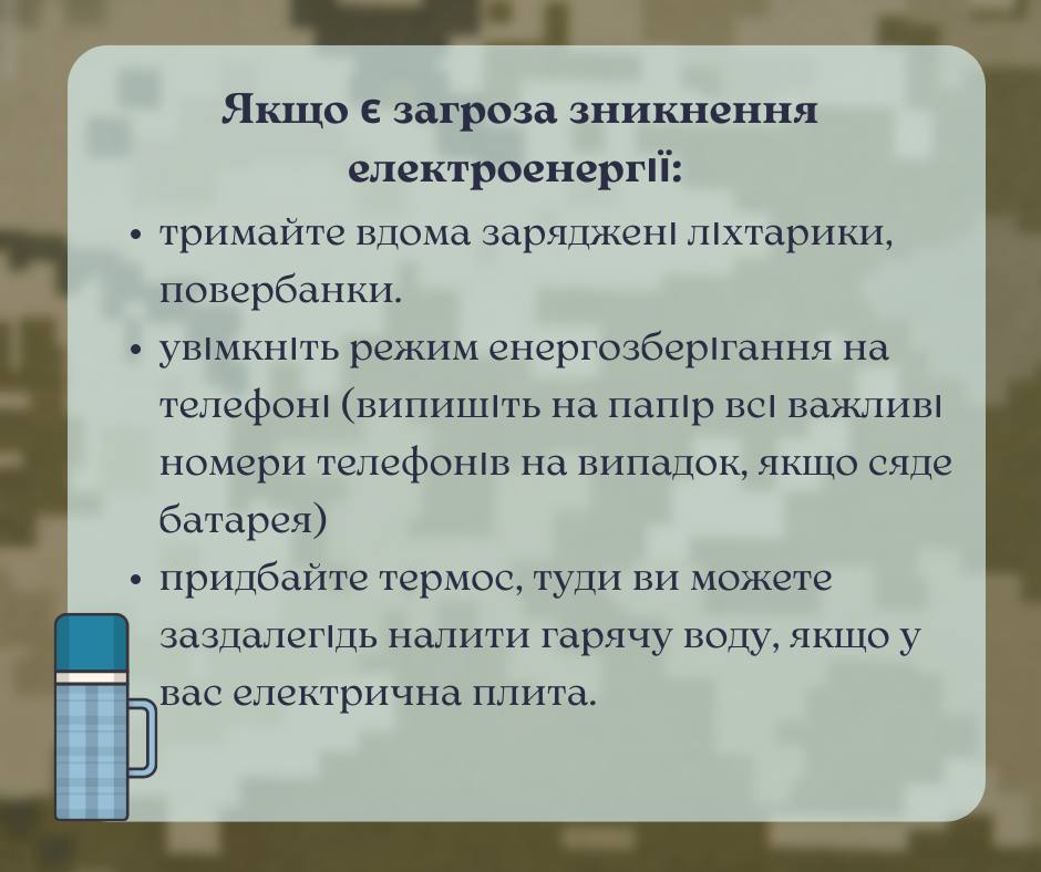 Киевлянам рекомендуют держать дома заряженные фонарики и пауербанки, запастись термосами, в которые можно залить горячую воду.