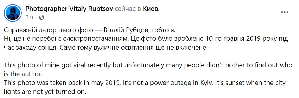 "Нет, это не перебои с электроснабжением. Это фото было сделано 10 мая 2019 во время заката. Именно поэтому уличное освещение еще не включено", - написал в Facebook автор снимка Виталий Рубцов.